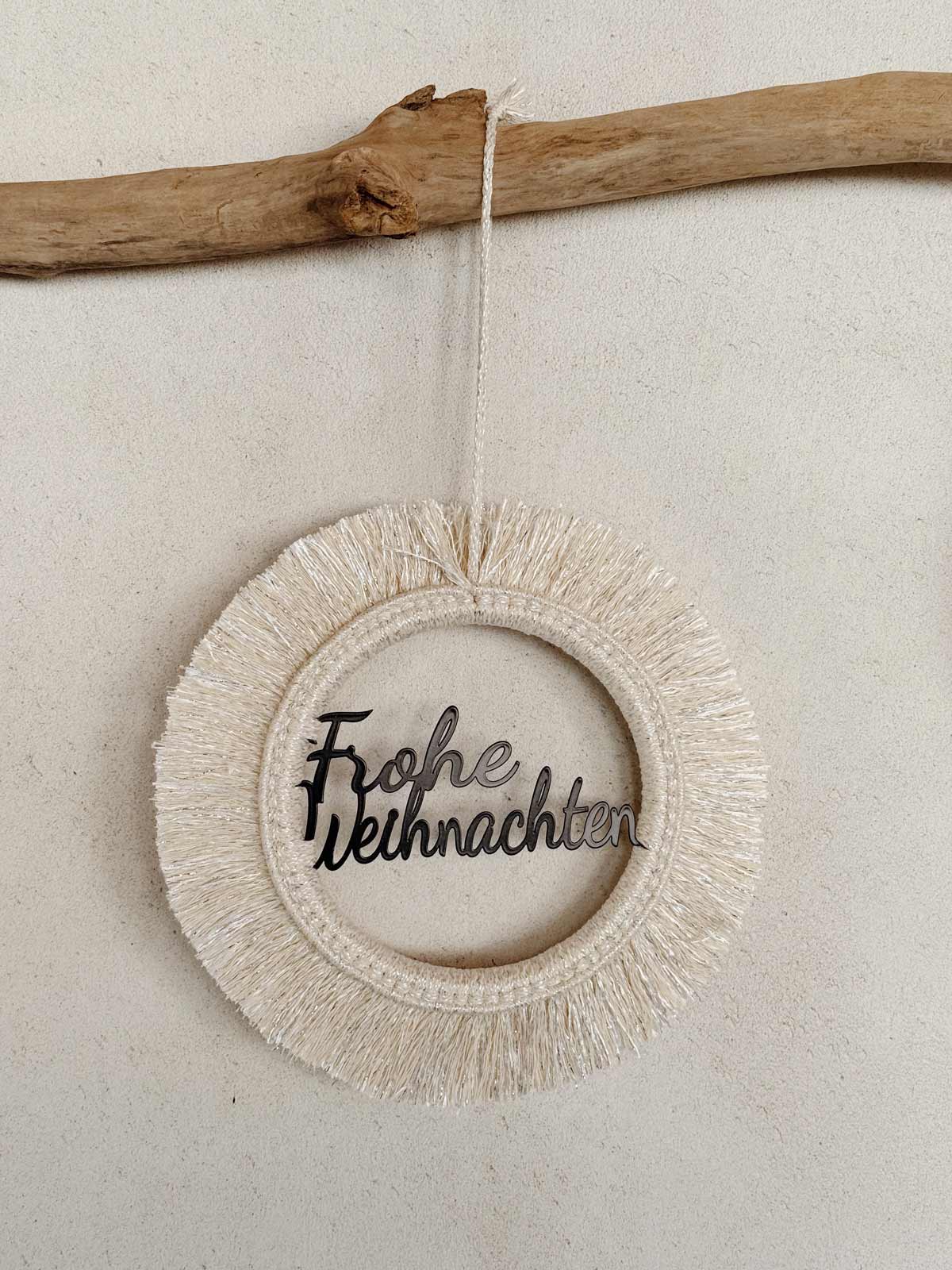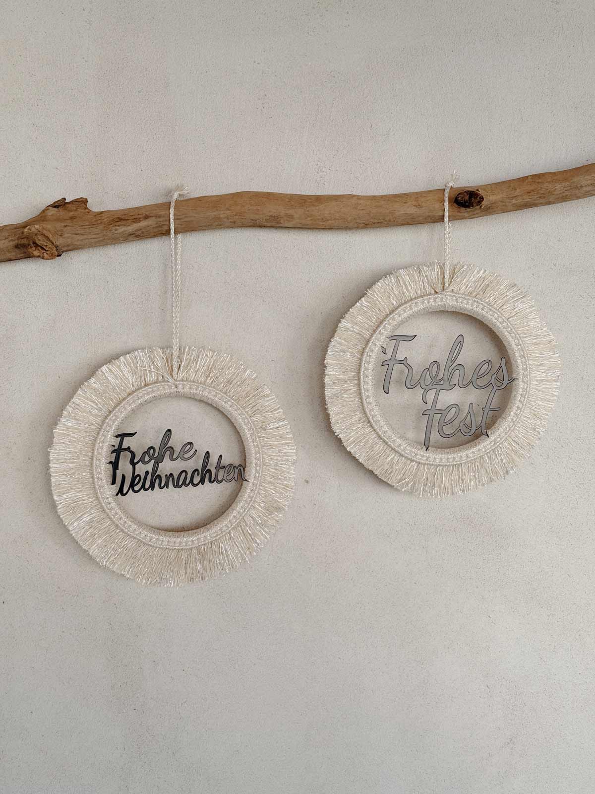 Bringe winterlichen Zauber in dein Zuhause mit meinem handgefertigten Makramee-Weihnachtskranz. Jeder Kranz wird von mir persönlich in liebevoller Handarbeit gefertigt und trägt eine stilvolle Gravur wie „Frohes Fest“ oder „Frohe Weihnachten“, die deinem Zuhause eine warme, festliche Stimmung verleiht.