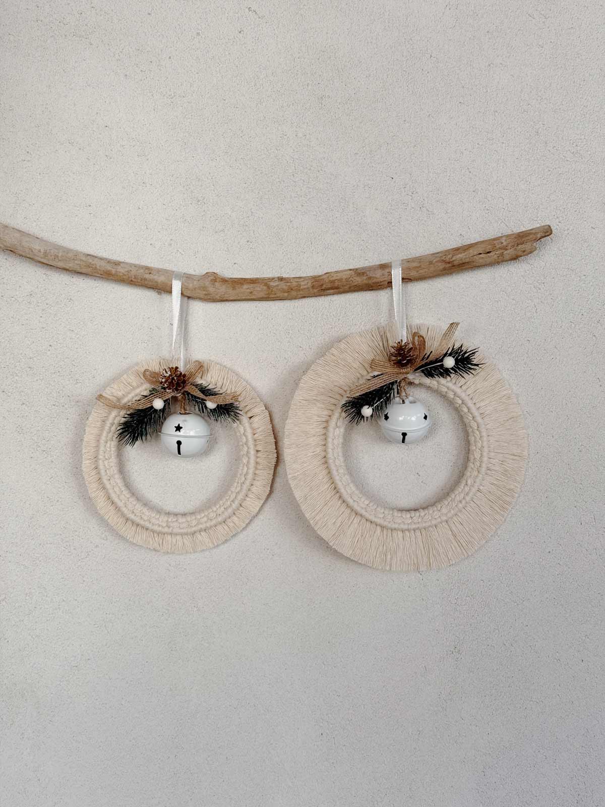 Dieser handgefertigte Makramee-Weihnachtskranz in Naturfarben bringt einen Hauch von winterlicher Gemütlichkeit in dein Zuhause. Mit viel Liebe geknüpft und mit einer weißen Glocke, kleinen Zapfen und winterlicher Deko verziert, verbindet er natürliche Boho-Ästhetik mit weihnachtlichem Charme.