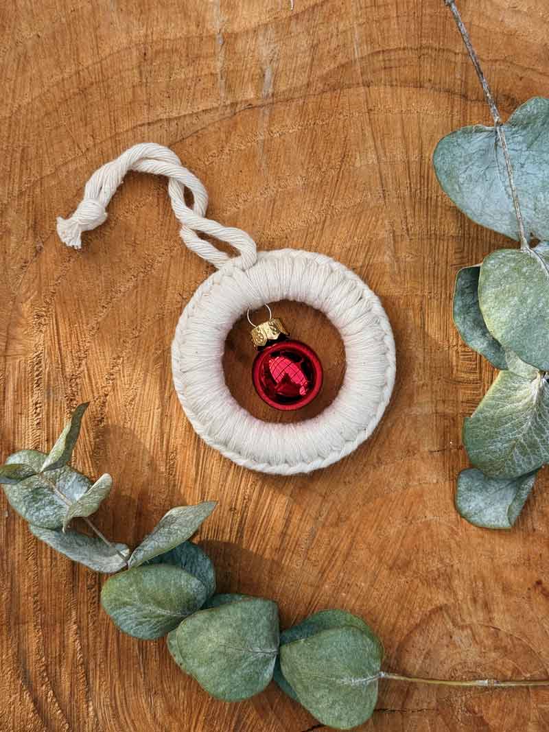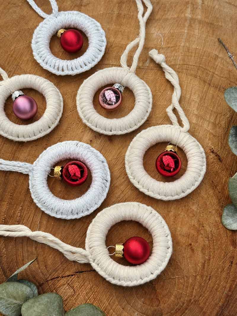 Setze glanzvolle Akzente in deiner Weihnachtsdekoration mit unseren handgefertigten Makramee-Weihnachtsanhängern mit einer Kugel in der Mitte. Jeder Anhänger ist ein kleines Kunstwerk, kunstvoll geknüpft und mit Liebe zum Detail gestaltet. Ob am Christbaum oder Geschenken - diese individuellen Anhänger verleihen deinem Fest eine persönliche Note und sind auch als liebevolles Geschenk perfekt geeignet.